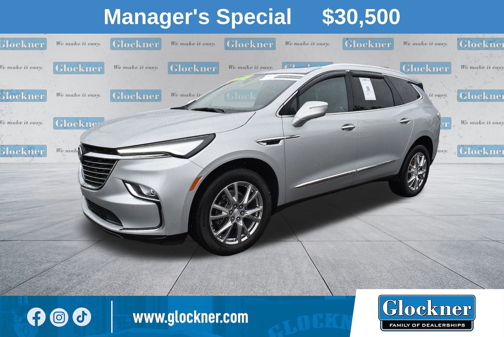 Glockner Ford Southpoint is proud to offer this handsome-looking 2022 Buick Enclave in Quicksilver Metallic. This 2022 Buick Enclave has passed our comprehensive inspection and comes with the following features; 5000lbs Trailering Package (Heavy-Duty Cooling System, Hitch Guidance, and Hitch Guidance w/Hitch View), Experience Buick Package (Front Power Sliding Moonroof), Floor Liner Package (LPO) (1st & 2nd Row All-Weather Floor Liners (LPO), 3rd Row All-Weather Floor Liner (LPO), and Integrated Cargo Liner (LPO)), Preferred Equipment Group 1SL (Front & Rear Park Assist and Heated Steering Wheel), Sound & Sites Package (120-Volt Power Outlet, Bose Performance-Enhanced 10-Speaker System, Radio: Buick Infotainment Sys AM/FM Stereo w/Nav, and SiriusXM w/360L), Technology Package (Adaptive Cruise Control, Enhanced Automatic Emergency Braking, HD Surround Vision, Inside Rearview Mirror w/Full Camera Display, Rear Camera Mirror Washer, and Rear Pedestrian Alert), Glockner Certified Certified, AWD, 18" Aluminum Wheels, 20" Polished Aluminum Wheels, 3.49 Axle Ratio, 3rd row seats: split-bench, 4-Wheel Disc Brakes, 6 Speakers, 6-Speaker Audio System Feature, 6-Way Power Front Passenger Seat Adjuster, 7-Passenger Seating, 8-Way Power Driver Seat Adjuster, ABS brakes, Air Conditioning, Alloy wheels, AM/FM radio: SiriusXM with 360L, Auto High-beam Headlights, Auto-dimming door mirrors, Auto-dimming Rear-View mirror, Automatic temperature control, Brake assist, Compass, Delay-off headlights, Driver door bin, Driver vanity mirror, Dual front impact airbags, Dual front side impact airbags, Electronic Stability Control, Emergency communication system: OnStar and Buick connected services capable, Four wheel independent suspension, Front anti-roll bar, Front Bucket Seats, Front Center Armrest, Front dual zone A/C, Front reading lights, Fully automatic headlights, Garage door transmitter, Heated door mirrors, Heated Driver & Front Passenger Seats, Heated front seats, Heated steering wheel, Illuminated entry, Leather steering wheel, Occupant sensing airbag, Outside temperature display, Overhead airbag, Overhead console, Panic alarm, Passenger door bin, Passenger vanity mirror, Perforated Leather-Appointed Seat Trim, Power door mirrors, Power Driver Lumbar Control Seat Adjuster, Power driver seat, Power Liftgate, Power Passenger Lumbar Control Seat Adjuster, Power passenger seat, Power steering, Power windows, Premium audio system: Buick Infotainment System, Puddle Lamps (LPO), Radio data system, Radio: Buick Infotainment System AM/FM Stereo, Rear air conditioning, Rear anti-roll bar, Rear reading lights, Rear window defroster, Rear window wiper, Remote keyless entry, Roof rack: rails only, Security system, Speed control, Speed-sensing steering, Spoiler, Steering wheel mounted audio controls, Tachometer, Telescoping steering wheel, Tilt steering wheel, Traction control, Trip computer, Turn signal indicator mirrors, Variably intermittent wipers, Voltmeter, Wireless Apple CarPlay/Wireless Android Auto, and Bumpers: body-color.