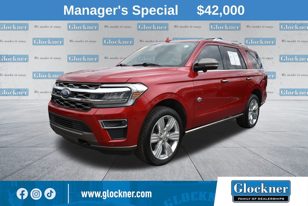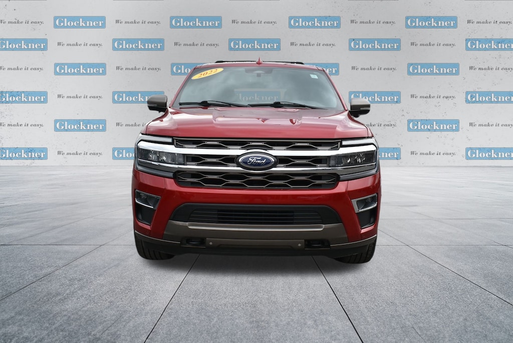 Glockner Ford Southpoint is proud to offer this good-looking 2022 Ford Expedition in Rapid Red Metallic Tinted Clearcoat. This 2022 Ford Expedition has passed our comprehensive inspection and comes with the following features; Equipment Group 400A Standard Package, Heavy-Duty Trailer Tow Package (3.73 Axle Ratio, 360-Degree Camera w/Trailer Reverse Guidance, Integrated Trailer Brake Controller, and Pro Trailer Backup Assist), Ford Blue Advantage: Blue Certified Certified, 4WD, 22 Speakers, 3rd row seats: split-bench, 4-Wheel Disc Brakes, ABS brakes, Adaptive suspension, Adjustable pedals, Advanced Cargo Manager, Air Conditioning, Alloy wheels, AM/FM radio: SiriusXM with 360L, Auto High-beam Headlights, Auto Start-Stop Removal, Auto-dimming door mirrors, Auto-dimming Rear-View mirror, Automatic temperature control, Brake assist, Bumpers: body-color, Compass, Delay-off headlights, Driver door bin, Driver vanity mirror, Dual front impact airbags, Dual front side impact airbags, Electronic Stability Control, Emergency communication system: SYNC 4 911 Assist, Exterior Parking Camera Rear, Four wheel independent suspension, Front anti-roll bar, Front Bucket Seats, Front Center Armrest, Front dual zone A/C, Front fog lights, Front reading lights, Fully automatic headlights, Garage door transmitter, Genuine wood console insert, Genuine wood dashboard insert, Genuine wood door panel insert, Heated door mirrors, Heated front seats, Heated rear seats, Heated steering wheel, Heated/Ventilated Del Rio Lthr Fr Captain's Chairs, Illuminated entry, Leather steering wheel, Memory seat, Navigation system: Connected Navigation, Occupant sensing airbag, Outside temperature display, Overhead airbag, Overhead console, Panic alarm, Passenger door bin, Passenger vanity mirror, Pedal memory, Power door mirrors, Power driver seat, Power Liftgate, Power moonroof, Power passenger seat, Power steering, Power windows, Radio data system, Radio: B&O Unleashed Sound System by Bang & Olufsen, Rain sensing wipers, Rear air conditioning, Rear anti-roll bar, Rear reading lights, Rear window defroster, Rear window wiper, Reclining 3rd row seat, Remote keyless entry, Security system, SiriusXM w/360L, Speed control, Speed-sensing steering, Speed-Sensitive Wipers, Split folding rear seat, Spoiler, Steering wheel memory, Steering wheel mounted audio controls, SYNC 4 w/Enhanced Voice Recognition, Tachometer, Telescoping steering wheel, Tilt steering wheel, Traction control, Trip computer, Turn signal indicator mirrors, Variably intermittent wipers, Ventilated front seats, Voltmeter, and Wheels: 22" 6-Spoke Polished Aluminum.