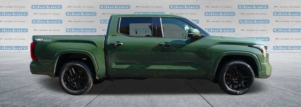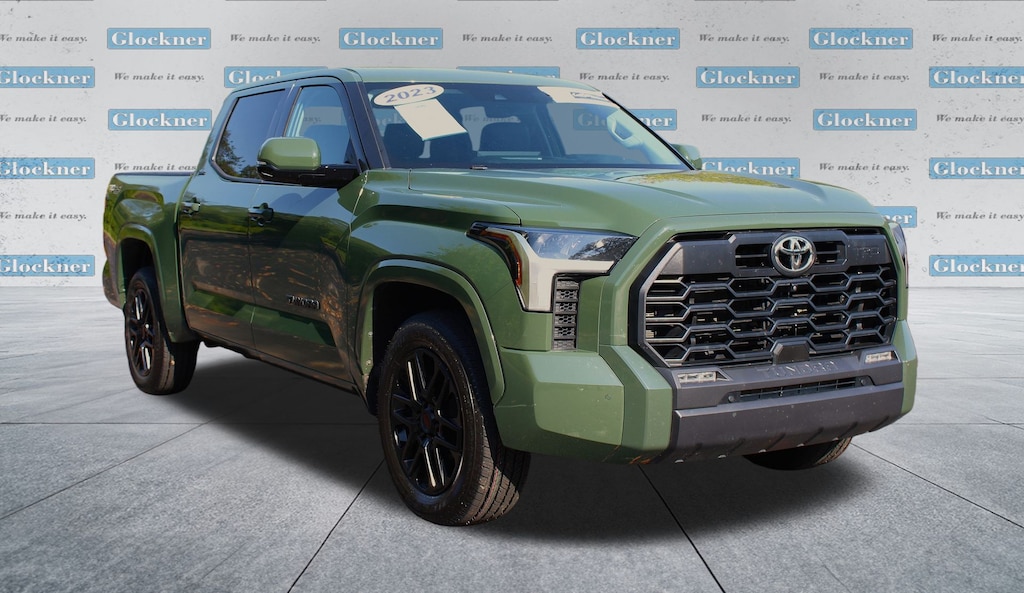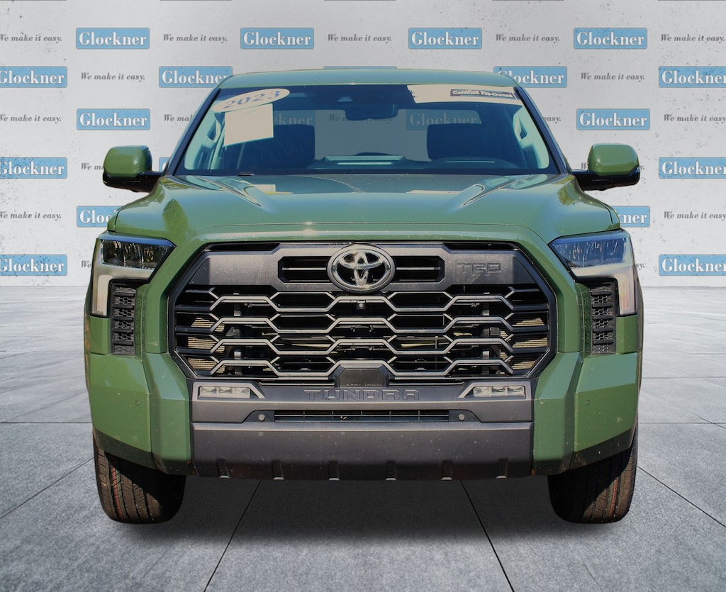 Glockner Honda Toyota is proud to offer this rock solid 2023 Toyota Tundra in Army Green. This 2023 Toyota Tundra has passed our comprehensive inspection and comes with the following features; Advanced Technology Package (32 Gallon Fuel Tank, Blind Spot Monitor w/Lane Change Assist, Multi-Terrain Back Monitor, and Parking Support Alert/Brake), SR5 Premium Package (8-Way Power-Adjustable Heated Front Seats and SofTex Seat Trim), Towing Package, TRD Sport Premium Package (Bedside TRD Sport Decal, TRD Sport-Tuned & Lowered Suspension, and Wheels: 20" Black Alloy), Glockner Certified Certified, 4WD, Black w/SofTex Seat Trim, Automatic temperature control, Exterior Parking Camera Rear, 18" Alloy Wheels, 3.31 Axle Ratio, 4-Way Adjustable Front Bucket Seats, 4-Wheel Disc Brakes, 9 Speakers, ABS brakes, Air Conditioning, Alloy wheels, AM/FM radio: SiriusXM, Apple CarPlay/Android Auto, Auto High-beam Headlights, Brake assist, Bumpers: body-color, Delay-off headlights, Driver door bin, Driver vanity mirror, Dual front impact airbags, Dual front side impact airbags, Electronic Stability Control, Emergency communication system: Safety Connect (10-year trial), Fabric Seat Trim (FB), Front anti-roll bar, Front Bucket Seats, Front Center Armrest, Front fog lights, Front reading lights, Front wheel independent suspension, Fully automatic headlights, Heated door mirrors, Illuminated entry, Knee airbag, Low tire pressure warning, Occupant sensing airbag, Outside temperature display, Overhead airbag, Overhead console, Panic alarm, Passenger door bin, Passenger vanity mirror, Power door mirrors, Power steering, Power windows, Radio data system, Radio: Audio Multimedia System, Rear reading lights, Rear step bumper, Rear window defroster, Remote keyless entry, Safety Connect, Security system, Speed control, Speed-sensing steering, Split folding rear seat, Steering wheel mounted audio controls, Tachometer, Telescoping steering wheel, Tilt steering wheel, Traction control, Trip computer, Variably intermittent wipers, and Voltmeter.