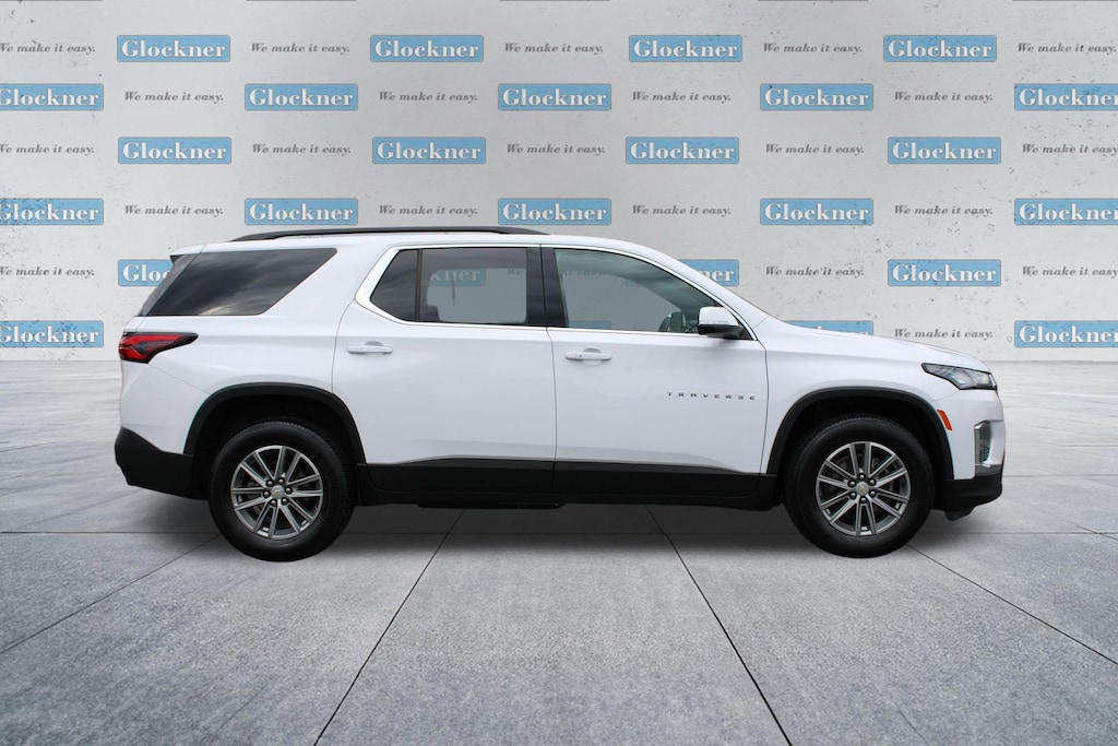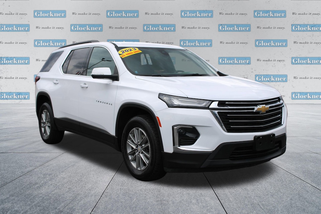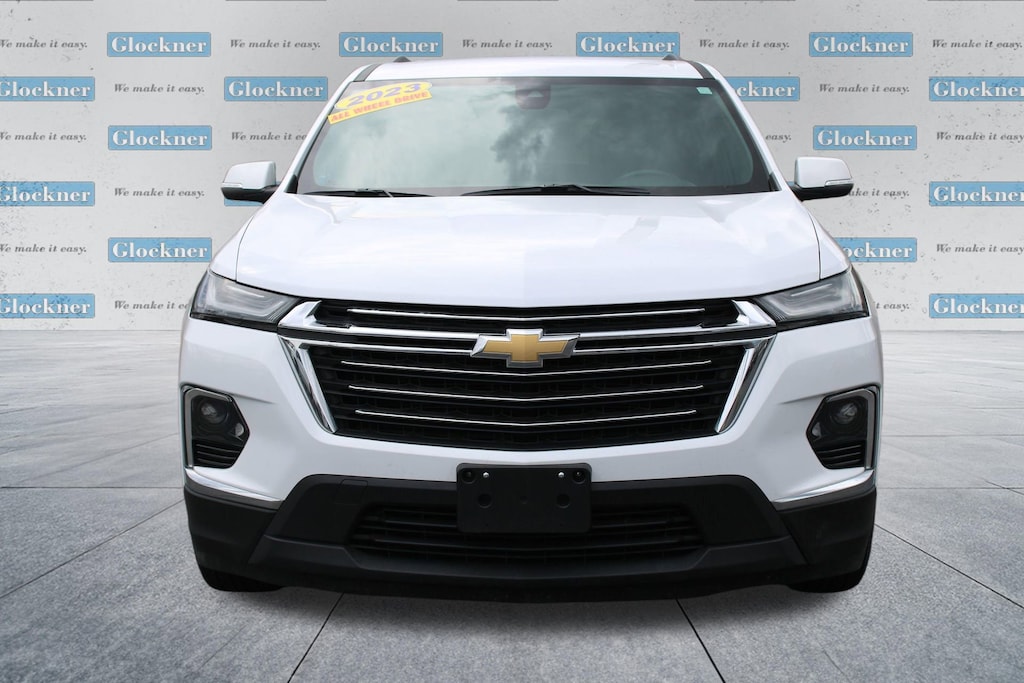 Glockner Chevrolet is proud to offer this fantastic-looking 2023 Chevrolet Traverse in Summit White. This 2023 Chevrolet Traverse has passed our comprehensive inspection and comes with the following features; Preferred Equipment Group 1LT (Heated Driver & Front Passenger Seats), Front License Plate Bracket Mounting Package, Traverse LT 1LT, Glockner Certified Certified, 4D Sport Utility, 3.6L V6 SIDI VVT, AWD, Summit White, 2-Way Manual Front Passenger Seat Adjuster, 3.49 Axle Ratio, 3rd row seats: split-bench, 4-Wheel Disc Brakes, 6 Speakers, 6-Speaker Audio System Feature, 8-Passenger Seating (2-3-3 Seating Configuration), 8-Way Power Driver Seat Adjuster, ABS brakes, Air Conditioning, Alloy wheels, AM/FM radio: SiriusXM, Apple CarPlay/Android Auto, Auto High-beam Headlights, Automatic temperature control, Black Roof Rails, Brake assist, Bumpers: body-color, Compass, Delay-off headlights, Driver door bin, Driver vanity mirror, Dual front impact airbags, Dual front side impact airbags, Electronic Stability Control, Emergency communication system, Exterior Parking Camera Rear, Four wheel independent suspension, Front anti-roll bar, Front Bucket Seats, Front Center Armrest, Front dual zone A/C, Front reading lights, Fully automatic headlights, Garage door transmitter, Heated door mirrors, Heated front seats, Illuminated entry, Leather steering wheel, Low tire pressure warning, Occupant sensing airbag, Outside temperature display, Overhead airbag, Overhead console, Panic alarm, Passenger door bin, Passenger vanity mirror, Power door mirrors, Power Driver Lumbar Control, Power driver seat, Power Liftgate, Power steering, Power windows, Premium Cloth Seat Trim, Radio data system, Radio: Chevrolet Infotainment 3 Plus System, Rear air conditioning, Rear anti-roll bar, Rear reading lights, Rear window defroster, Rear window wiper, Remote keyless entry, Security system, SiriusXM w/360L, Speed control, Speed-sensing steering, Spoiler, Steering wheel mounted audio controls, Tachometer, Telescoping steering wheel, Tilt steering wheel, Traction control, Trip computer, Turn signal indicator mirrors, Variably intermittent wipers, Voltmeter, and Wheels: 18 Bright Silver-Painted Aluminum.