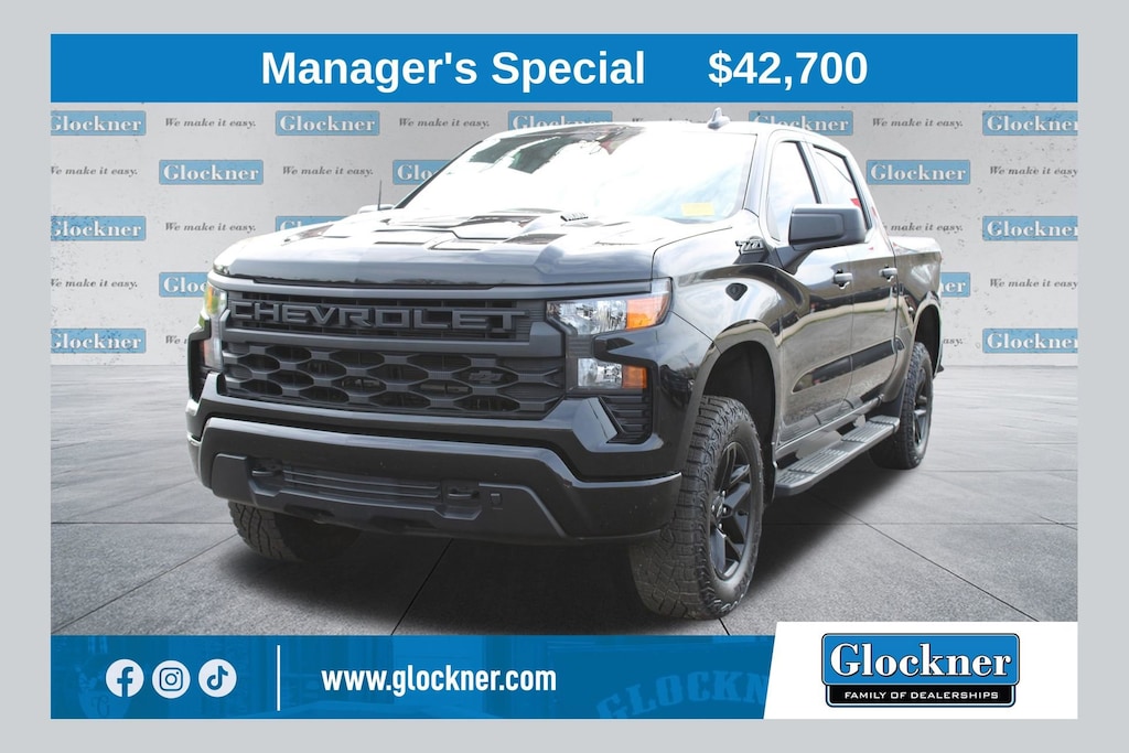 Glockner Chevrolet is proud to offer this stout 2025 Chevrolet Silverado 1500 in Black. This 2025 Chevrolet Silverado 1500 has passed our comprehensive inspection and comes with the following features; Custom Convenience Package (Electric Rear-Window Defogger, EZ Lift Power Lock & Release Tailgate, LED Cargo Area Lighting, Remote Vehicle Starter System, and Theft Deterrent System (Unauthorized Entry)), Dark Appearance Package (Black Chrome Exhaust Tip (LPO), Chevytec Spray-On Black Bedliner, Front Frame-Mounted Black Recovery Hooks, and Single Outlet Exhaust), Preferred Equipment Group 2CX (10-Way Power Driver Seat w/Lumbar, 120-Volt Bed Mounted Power Outlet, 120-Volt Interior Power Outlet, 3.5 Monochromatic Display Driver Info Center, Auto-Locking Rear Differential, Bluetooth® For Phone, Color-Keyed Carpeting Floor Covering, Deep-Tinted Glass, Dual Rear USB Ports (Charge Only), Electronic Cruise Control, Front Rubberized Vinyl Floor Mats, HD Rear Vision Camera, Manual Tilt Wheel Steering Column, OnStar Services Capable, Performance Red Recovery Hooks, Power Front Windows w/Driver Express Up/Down, Power Front Windows w/Passenger Express Down, Power Rear Windows w/Express Down, Rear 60/40 Folding Bench Seat (Folds Up), Rear Rubberized-Vinyl Floor Mats, Remote Keyless Entry, SiriusXM Trial Subscription, Standard Tailgate, Teen Driver, Tire Pressure Monitoring System, and Wi-Fi Hot Spot Capable), Suspension Package (Heavy-Duty Air Filter and Hill Descent Control), Trailering Package (Hitch Guidance), Glockner Certified Certified, 10-Speed Automatic, 4WD, Black Cloth, 6 Rectangular Black Tubular Assist Steps (LPO), 220 Amp Alternator, 4-Wheel Disc Brakes, 40/20/40 Front Split-Bench Seat, 6 Speakers, 6-Speaker Audio System, ABS brakes, Air Conditioning, Alloy wheels, AM/FM radio: SiriusXM, Apple CarPlay/Android Auto, Auto High-beam Headlights, Automatic Emergency Braking, Brake assist, Cloth Seat Trim, Compass, Delay-off headlights, Driver door bin, Driver vanity mirror, Dual Exhaust w/Polished Outlets, Dual front impact airbags, Dual front side impact airbags, Electronic Stability Control, Emergency communication system: OnStar, Engine Block Heater, Following Distance Indicator, Forward Collision Alert, Front anti-roll bar, Front Center Armrest w/Storage, Front Pedestrian Braking, Front reading lights, Front wheel independent suspension, Fully automatic headlights, Heated door mirrors, Illuminated entry, Integrated Trailer Brake Controller, IntelliBeam Automatic High Beam On/Off, Lane Keep Assist w/Lane Departure Warning, Low tire pressure warning, Multi-Flex Tailgate, Occupant sensing airbag, Outside temperature display, Overhead airbag, Overhead console, Panic alarm, Passenger door bin, Passenger vanity mirror, Power door mirrors, Power driver seat, Power steering, Power windows, Premium audio system: Chevrolet Infotainment 3, Radio data system, Radio: Chevrolet Infotainment 3 System, Rear reading lights, Rear step bumper, Rear Wheelhouse Liners, Rear window defroster, Remote keyless entry, Security system, Speed control, Speed-sensing steering, Split folding rear seat, Tachometer, Tilt steering wheel, Traction control, Trip computer, Variably intermittent wipers, Voltmeter, and Wheels: 18 x 8.5 Black Painted Aluminum.Clean Auto Check/No Accidents Reported, One Owner, Full Balance of Factory Warranty, Local Trade, 10-Speed Automatic, 4WD, Black Cloth, 10-Way Power Driver Seat w/Lumbar, 120-Volt Bed Mounted Power Outlet, 120-Volt Interior Power Outlet, 3.5 Monochromatic Display Driver Info Center, 6 Rectangular Black Tubular Assist Steps (LPO), Auto-Locking Rear Differential, Black Chrome Exhaust Tip (LPO), Bluetooth® For Phone, Chevytec Spray-On Black Bedliner, Color-Keyed Carpeting Floor Covering, Custom Convenience Package, Dark Appearance Package, Deep-Tinted Glass, Dual Rear USB Ports (Charge Only), Electric Rear-Window Defogger, Electronic Cruise Control, EZ Lift Power Lock & Release Tailgate, Front Frame-Mo