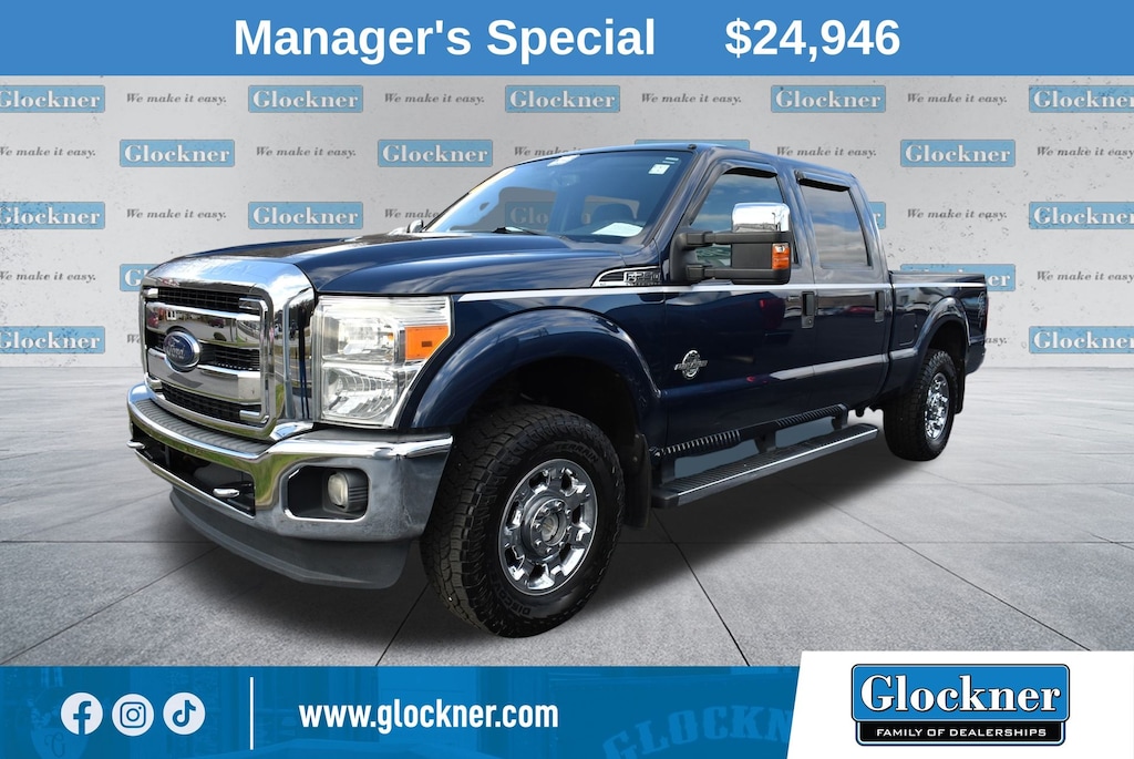Glockner Ford Southpoint is proud to offer this dependable 2013 Ford F-250SD in Blue. This 2013 Ford F-250SD has passed our comprehensive inspection and comes with the following features; GVWR: 10,000 lb Payload Package, 4WD, 17" 6 Spoke Cast Aluminum (4) Wheels, 3.73 Axle Ratio, 4 Speakers, 4-Wheel Disc Brakes, ABS brakes, Air Conditioning, Alloy wheels, AM/FM radio, Brake assist, Bumpers: chrome, Cloth 40/20/40 Split Bench Seat, Compass, Driver door bin, Driver vanity mirror, Dual front impact airbags, Dual front side impact airbags, Electronic Stability Control, Front anti-roll bar, Front Center Armrest w/Storage, Front reading lights, Heated door mirrors, Illuminated entry, Outside temperature display, Overhead airbag, Overhead console, Panic alarm, Passenger door bin, Passenger vanity mirror, Power door mirrors, Power steering, Power windows, Radio data system, Radio: AM/FM Stereo/Single-CD/MP3 Player, Rear reading lights, Rear seat center armrest, Rear step bumper, Remote keyless entry, Security system, Speed control, Split folding rear seat, Steering wheel mounted audio controls, Tachometer, Telescoping steering wheel, Tilt steering wheel, Traction control, Turn signal indicator mirrors, Variably intermittent wipers, and CD player.