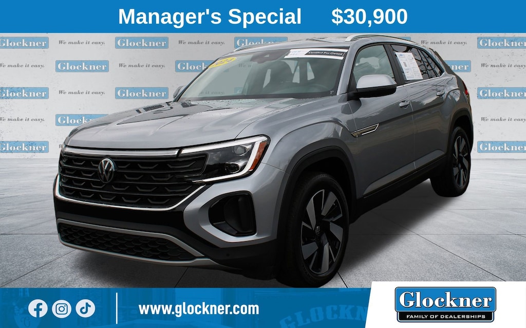 Glockner Chevrolet is proud to offer this superb-looking 2024 Volkswagen Atlas Cross Sport in Silver Mist Metallic. This 2024 Volkswagen Atlas Cross Sport has passed our comprehensive inspection and comes with the following features; Atlas Cross Sport 2.0T SE w/Technology (A8), Glockner Certified Certified, 4D Sport Utility, 2.0L TSI, Silver Mist Metallic, 3.60 Axle Ratio, 4-Wheel Disc Brakes, 4-Wheel Independent Suspension, 6 Speakers, ABS brakes, Air Conditioning, Alloy wheels, AM/FM radio: SiriusXM with 360L, Auto-dimming Rear-View mirror, Automatic temperature control, Brake assist, Bumpers: body-color, Compass, Delay-off headlights, Driver door bin, Driver vanity mirror, Dual front impact airbags, Dual front side impact airbags, Electronic Stability Control, Emergency communication system: VW Car-Net Safe & Secure 5-year, Exterior Parking Camera Rear, Four wheel independent suspension, Front anti-roll bar, Front Bucket Seats, Front Center Armrest, Front dual zone A/C, Front fog lights, Front reading lights, Fully automatic headlights, Heated & Actively Ventilated Front Seats, Heated door mirrors, Heated front seats, Heated steering wheel, Illuminated entry, Low tire pressure warning, Occupant sensing airbag, Outside temperature display, Overhead airbag, Overhead console, Panic alarm, Passenger door bin, Passenger vanity mirror, Perforated V-Tex Leatherette Seating Surfaces, Power door mirrors, Power driver seat, Power Liftgate, Power steering, Power windows, Radio data system, Radio: MIB3 Composition Media AM/FM/HD, Rain sensing wipers, Rear anti-roll bar, Rear reading lights, Rear seat center armrest, Rear window defroster, Rear window wiper, Remote keyless entry, Security system, Speed control, Speed-sensing steering, Split folding rear seat, Spoiler, Steering wheel mounted audio controls, Tachometer, Telescoping steering wheel, Tilt steering wheel, Traction control, Trip computer, Turn signal indicator mirrors, Variably intermittent wipers, Ventilated front seats, and Wheels: 20 5-Spoke 2-Tone Machined Alloy.